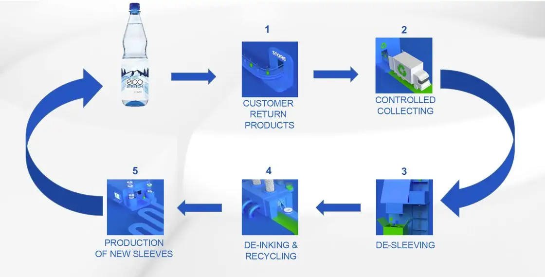 EcoStretch™ is a new technology that enables the post-consumer de-inking of printed stretch sleeves. The sleeves are removed from the bottle after the PET bottles are returned to the filling lines of the producers. They are then shipped to the Austrian Voelkermarkt site, where – after the de-inking and cleaning – the sleeves are molten and shaped into pellets which feed back into the manufacturing process, thus creating a new stretch sleeve in a closed loop.