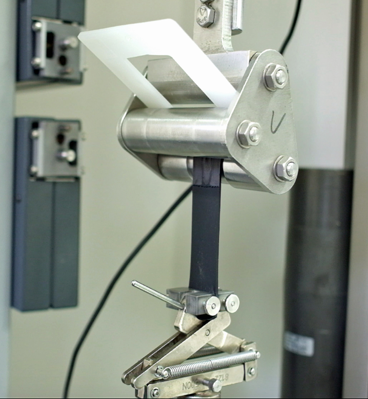 PHOTO CAPTIONS: 01. Graph shows peel strength test results for one Medalist® TPE over-molded onto four Tritan substrates. Blue shows average peel strength, while peak peel strength is indicated by gray in background. 02. Peel strength was measured in 90-degree pull test on a Zwick tensionometer with 100 mm/min. pulling rate in accordance with DIN EN 1464.