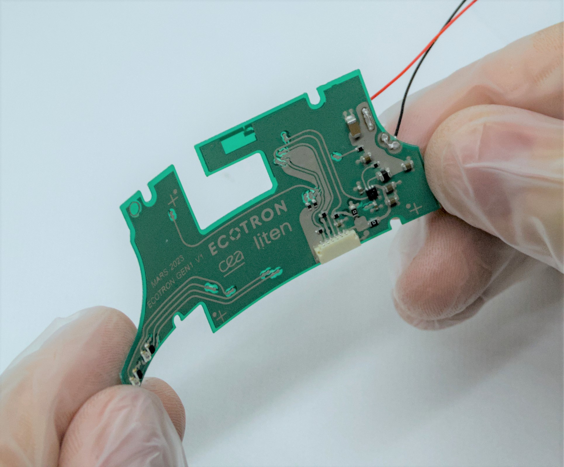 The CEA research institute in France, in collaboration with its industry partner, contributes a medical device use case with a flexible printed circuit board (PCB) within the EU-funded project ECOTRON. The first generation of the use case (GEN1) demonstrates that a conventional PCB can be replaced with a flexible printed one to create more sustainable healthcare and wearable devices with no compromise on performance. The flexible printed circuit board is produced in an additive manufacturing process that uses less energy and chemicals. The future use case generations will include dismantling technologies (GEN2) and bio-based/recycled materials for substrates and inks (GEN3) developed in the project.