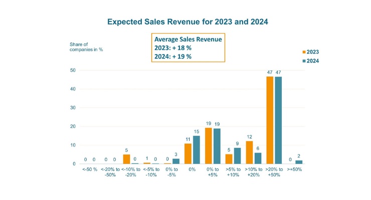 The results of the recent 2023 OE-A Business Climate Survey demonstrate expectations of continued growth, consistent with projections made in the 2022 survey. For 2023 the responding association members anticipate sales revenue increases of 18 percent for the Flexible and Printed Electronics Industry. The outlook for 2024 is promising as well with an estimated growth of 19 percent. “The consistently optimistic results year-on-year in the face of current global uncertainties reflect an underlying confidence in the technologies and applications before us,” summarizes Stan Farnsworth, chair of the OE-A board and chief marketing officer of PulseForge. The results of the OE-A Business Climate Survey were presented in a special session for the international press at LOPEC 2023 in Munich, Germany. The semi-annual survey is conducted by OE-A (Organic and Printed Electronics Association), an international Working Group within VDMA.